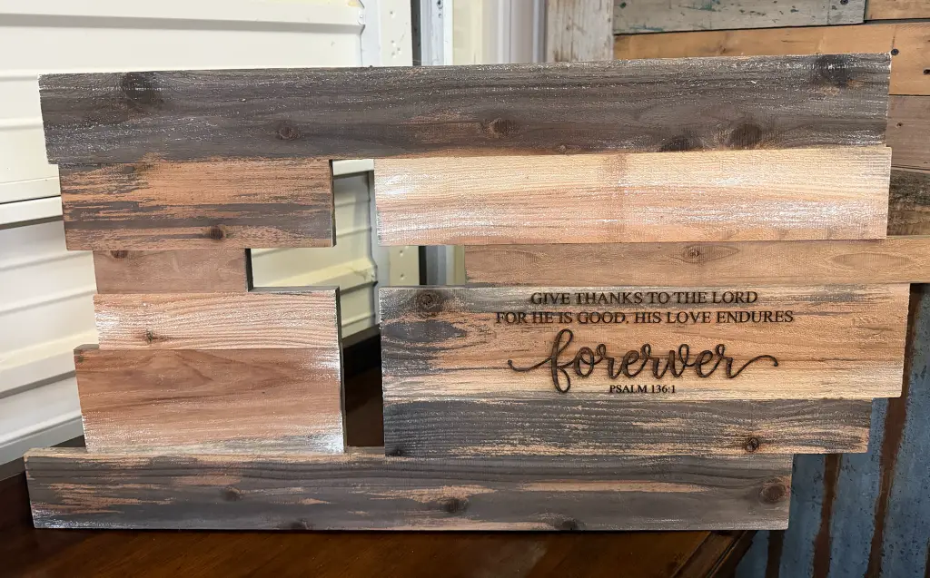 In this hands-on class, you’ll assemble, stain, and finish your project, plus add a custom laser-engraved scripture or phrase.